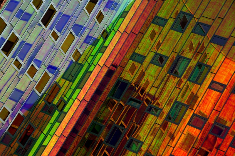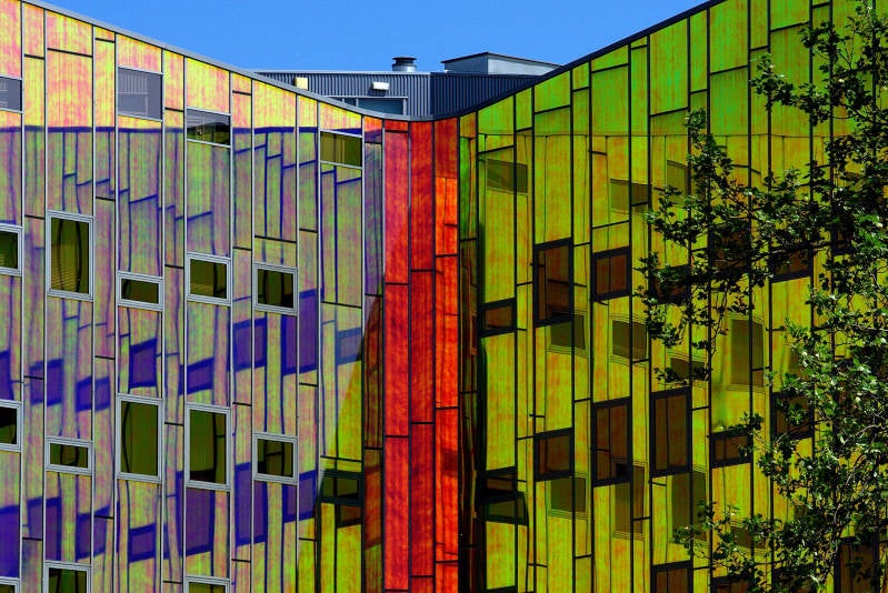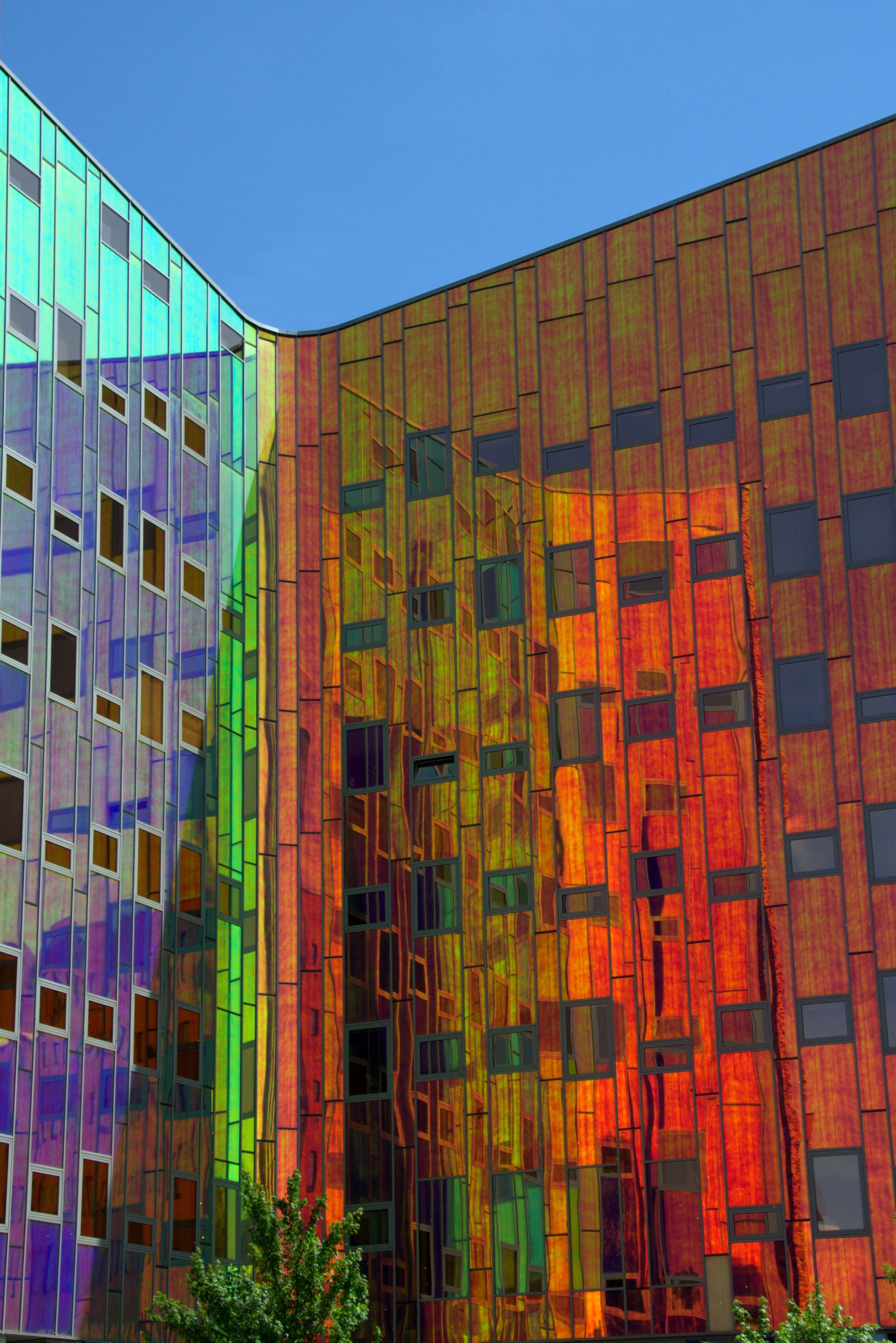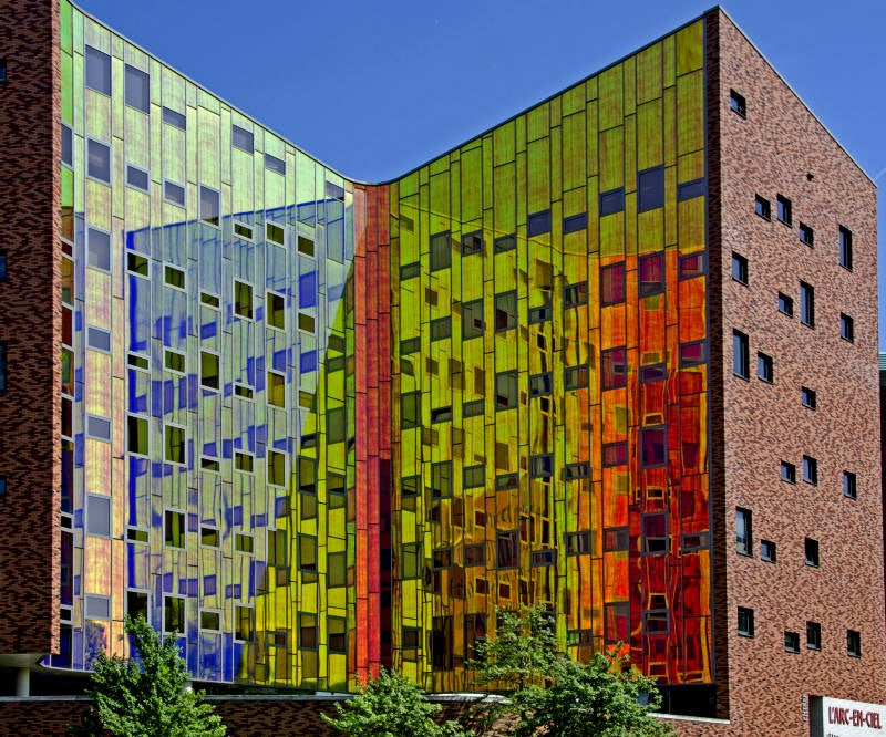In Deventer staat het kantoorgebouw l’Arc en Ciel (Regenboog). De ruwbouw bestaat uit prefab beton, de buitengevel uit glas, gepoedercoat aluminium en gevelsteen. I’M architecten uit Deventer heeft het gebouw ontworpen, waarbij de “binnengevel’ een eyecatcher werd door de gekozen gevelafwerking in glas. Dit glas kleurt bij lichtinval onder diverse hoeken anders op. Hierdoor kan op hetzelfde moment een deel van de gevel groen oplichten terwijl een ander deel oranje kan oplichten; kortom een regenboog.